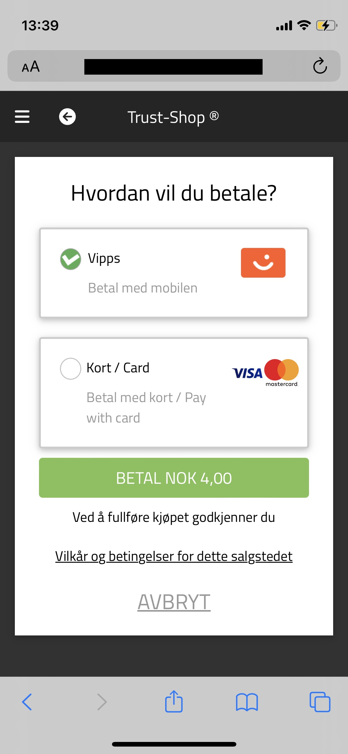 Hvis Vipps er nede har vi sett at kortbetaling likevel fungerer!